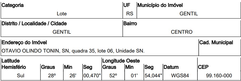 . AVENIDA OTÁVIO OLINDO TONIN,N. 00 QD 35, LT 06, CENTRO - CEP: 99160-000, GENTIL - RIO GRANDE DO SUL