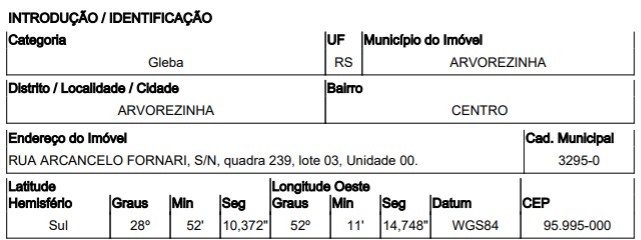 Localização: Terreno em Endereço: RUA ARCÂNGELO FORNARI | Bairro: CENTRO | Número: N. 00 QD 239 ARVOREZINHA - RS